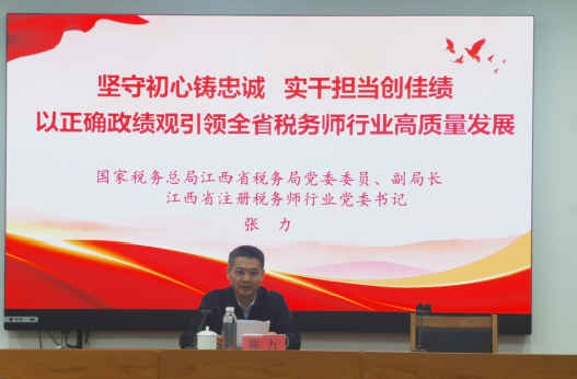 张力同志以“坚守初心铸忠诚、实干担当创佳绩 以正确政绩观引领全省税务师行业高质量发展”为题讲授专题党课,系统阐释了正确政绩观的核心要义、实践要求与重要意义,明确了行业学习教育的重点任务;聚焦恪守执业规范,着重强调合规经营是税务师行业的生命线、底线、红线,从强化合规意识、健全合规体系、规范执业行为等方面作出刚性要求;围绕加强党的领导,全面回顾过去一年全省税务师行业党建工作扎实成效,深刻查摆短板弱项,对今年行业党建工作作出四方面部署:一是强化政治铸魂,把稳行业发展方向。二是建强基层组织,提升“两个覆盖”质效。三是推动党业融合,践行行业初心使命。四是拧紧责任链条,构建长效工作格局。
